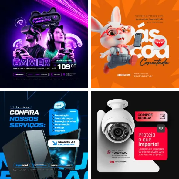 Dark-themed tech designs for gaming services and home security setups.