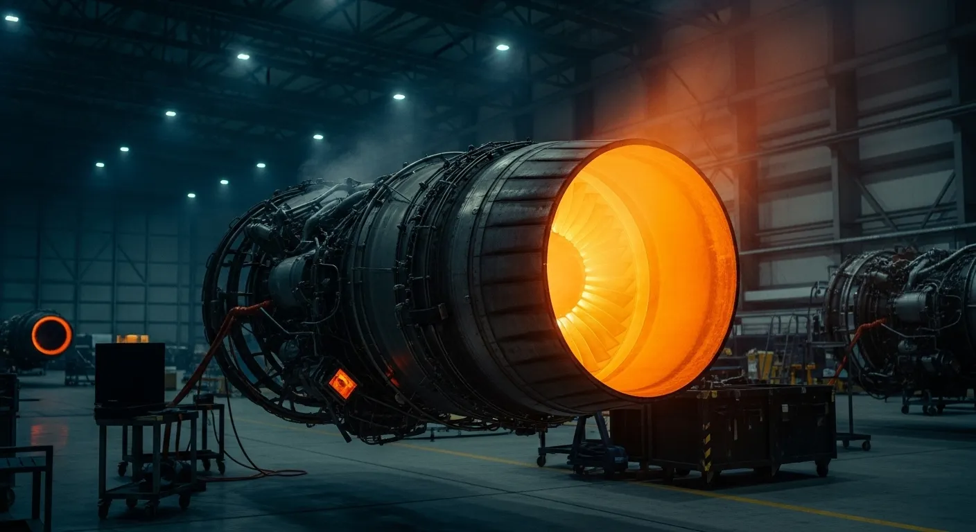 High-tech jet engine turbine glowing with heat in a modern hangar setting.