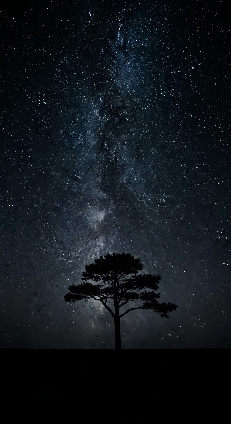 Dramatic silhouette of a tree under a vast starry galaxy sky.