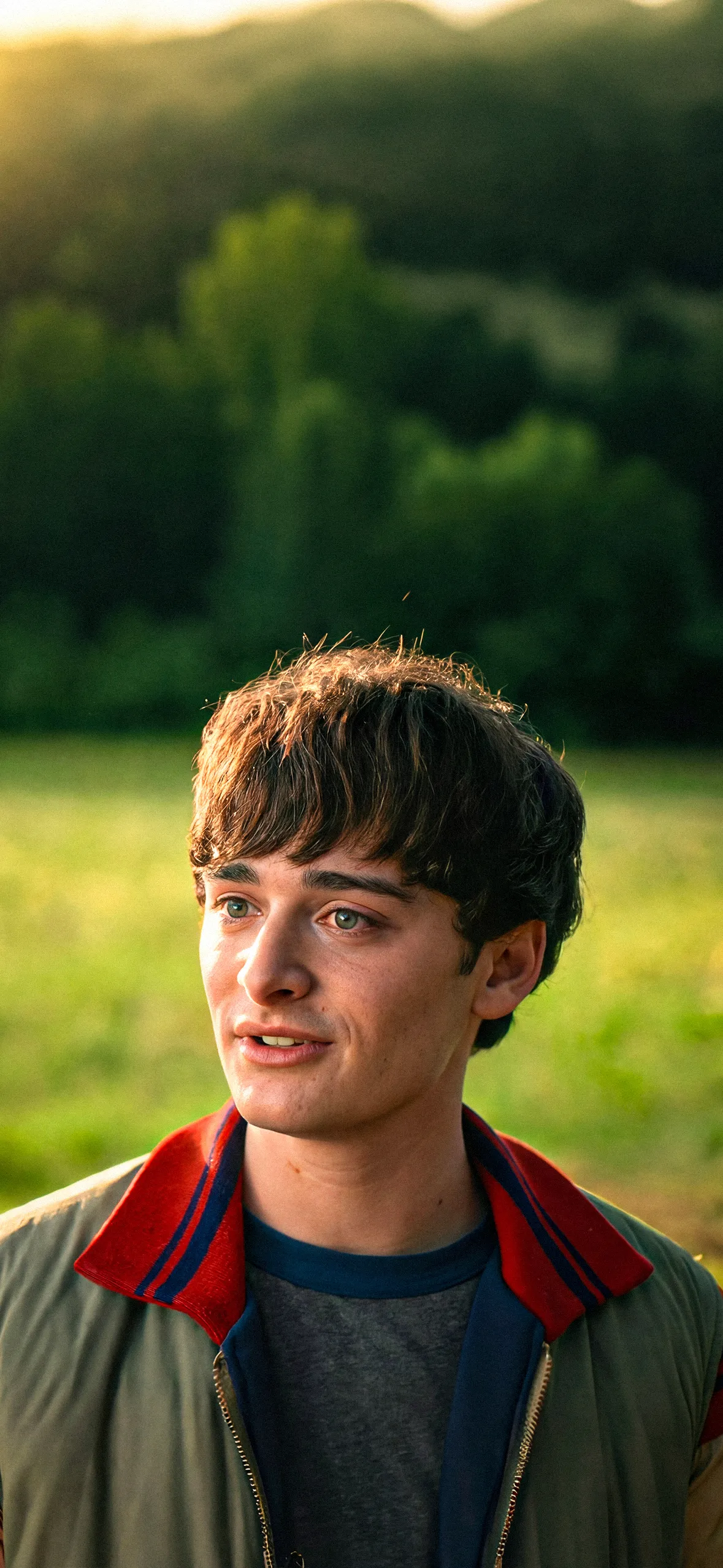 Download this Will Byers (Noah Schnapp) 4K wallpaper for your iPhone and enjoy the view of his green eyes and signature haircut. This wallpaper captures Noah in his tan jacket with a red and blue collar, set against a blurred green field.