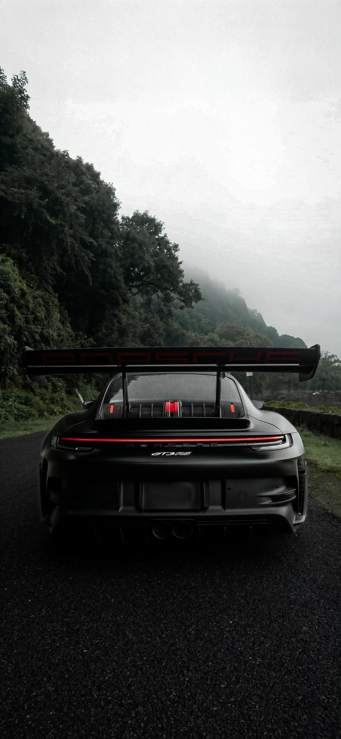 The aggressive stance of a dark Porsche GT3, featuring its distinctive large rear wing and a luminous red taillight, cuts through a mysterious misty road in this compelling 4K wallpaper. This stunning automobile wallpaper is perfect for iPhone users seeking a blend of power and moody aesthetics.