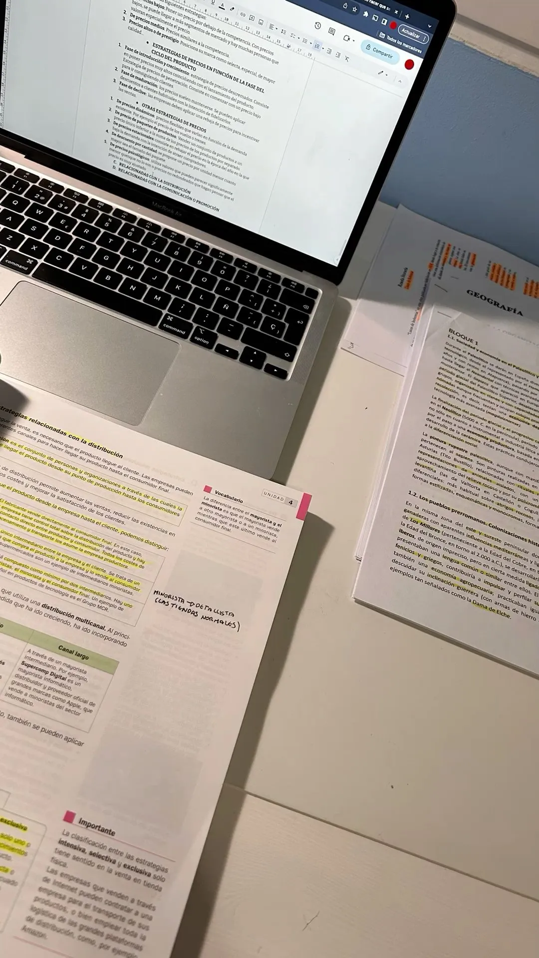 an open laptop computer sitting on top of a white desk next to papers and pens