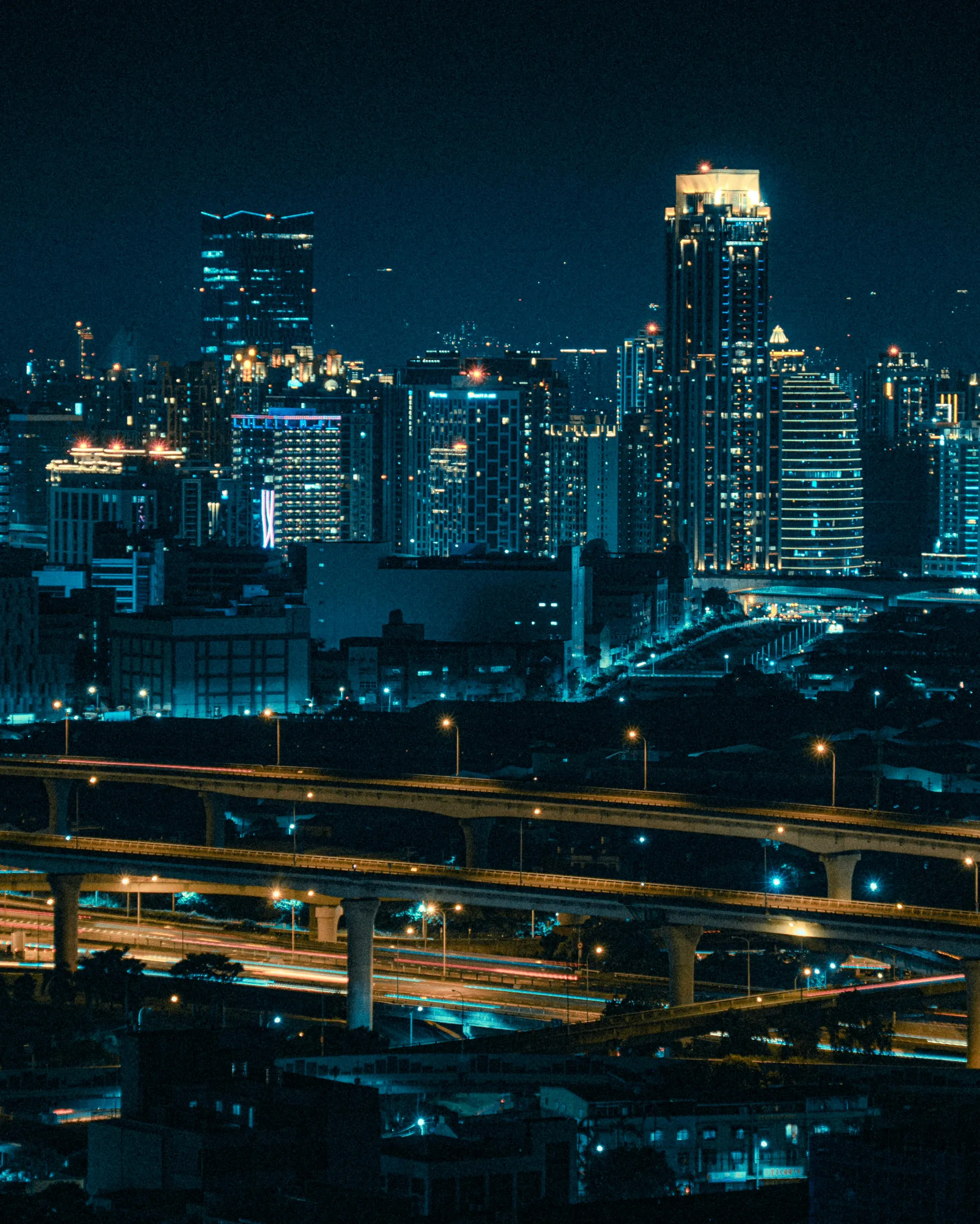 Free A vibrant nighttime cityscape featuring glowing skyscrapers and intricate highways under the city lights. Stock Photo