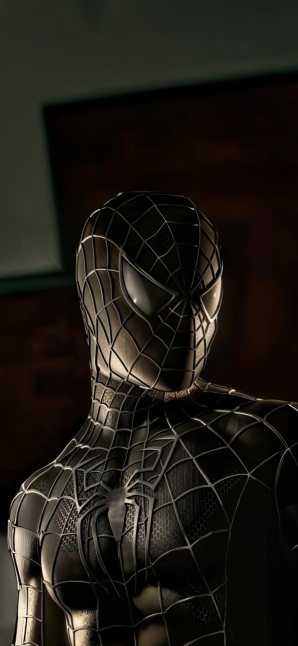Immerse yourself in the dark elegance of this stunning Black Suit Spider-Man 4K wallpaper, showcasing the hero's textured symbiote suit with its intricate web pattern and striking white eyes. This high-resolution wallpaper is perfectly optimized for your iPhone, offering a powerful and visually captivating display for your mobile device.