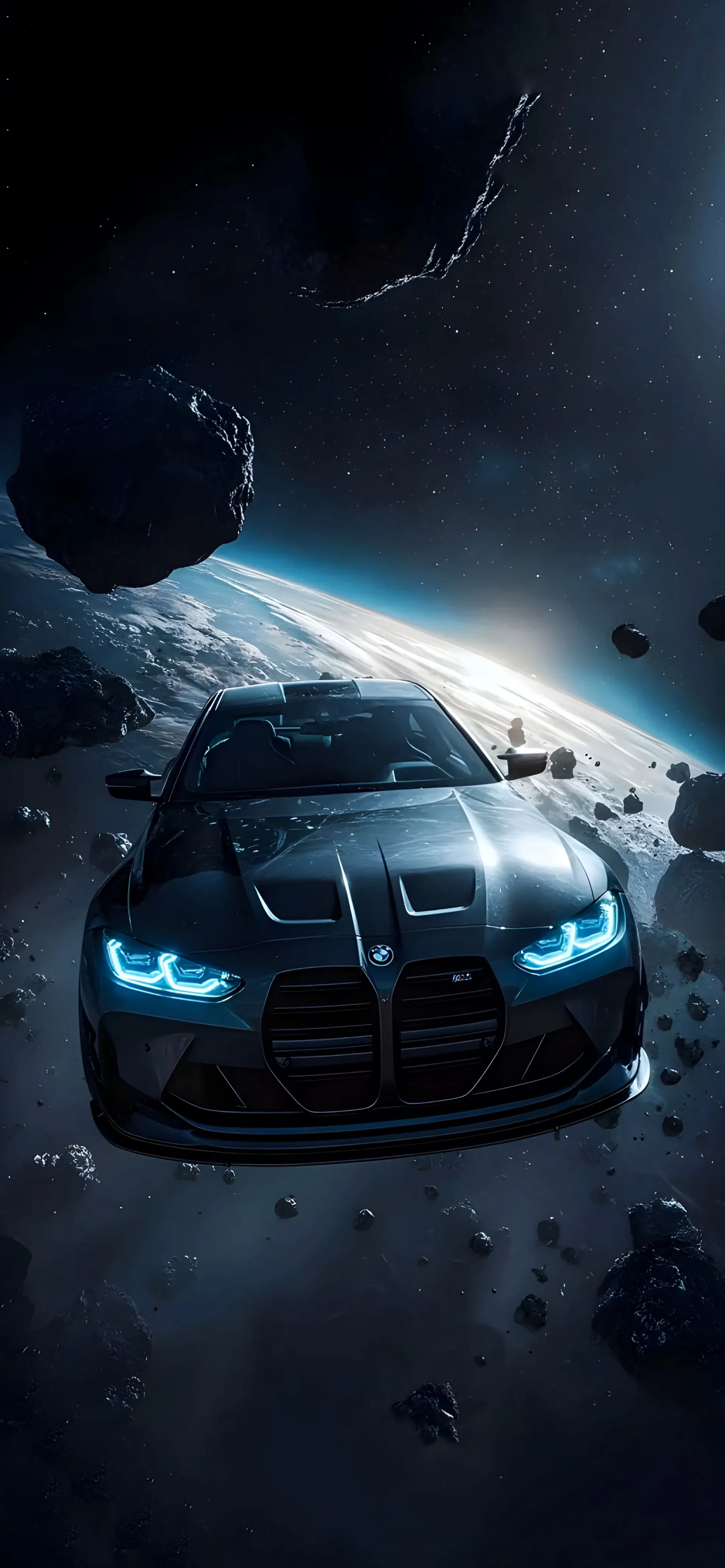 This high-octane wallpaper features a sleek, black BMW M4 (G82) drifting through a deep-space asteroid field. The vehicle’s signature "M Power" laser headlights cut through the cosmic darkness, reflecting off floating space debris and distant starlight. It is the perfect choice for automotive enthusiasts looking for a "Dark Mode" aesthetic that blends hyper-realistic car rendering with sci-fi elements.