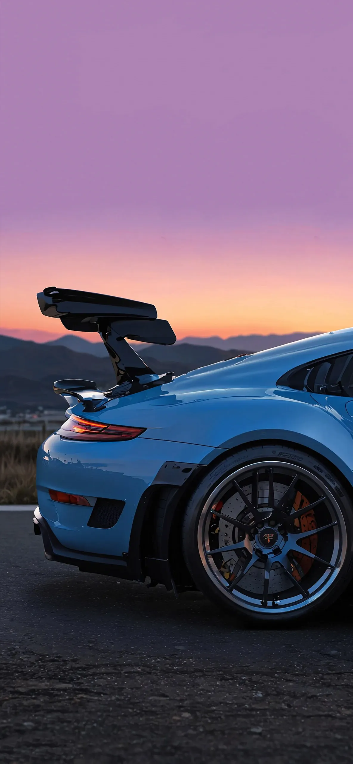 Download this Porsche 4K wallpaper for your iPhone, featuring a light blue paint job. The wallpaper captures the car's aerodynamic wing and intricate wheel design set against a beautiful sunset backdrop.