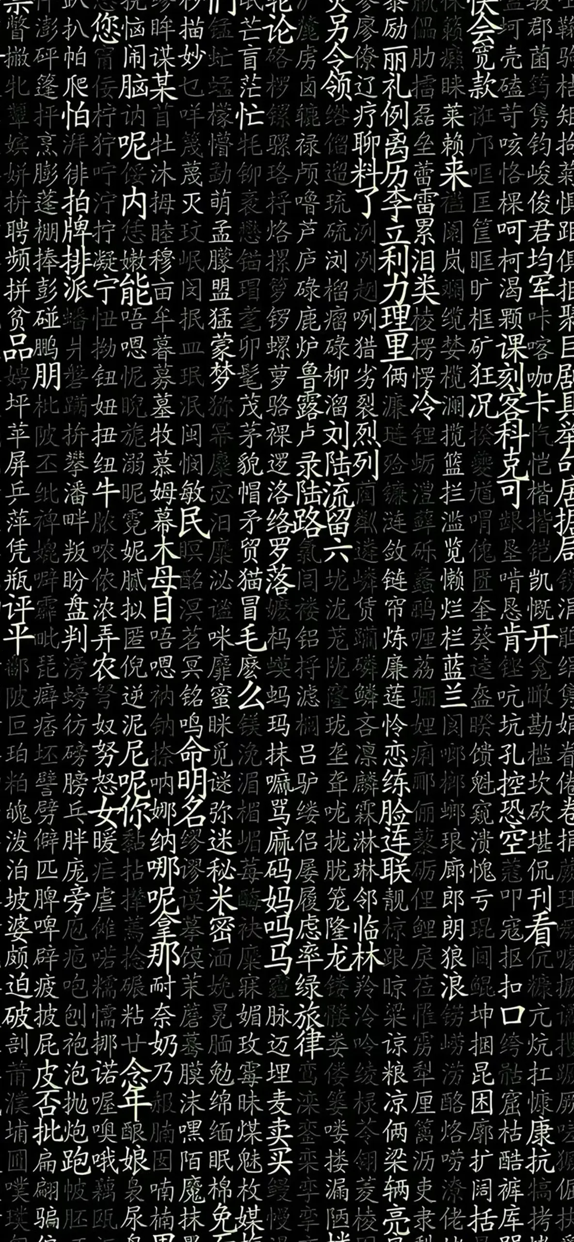 This 4K wallpaper features a mesmerizing pattern of Chinese characters in white against a solid black background, perfect for your iPhone. The dense arrangement and varying character sizes create a visually rich and dynamic wallpaper.