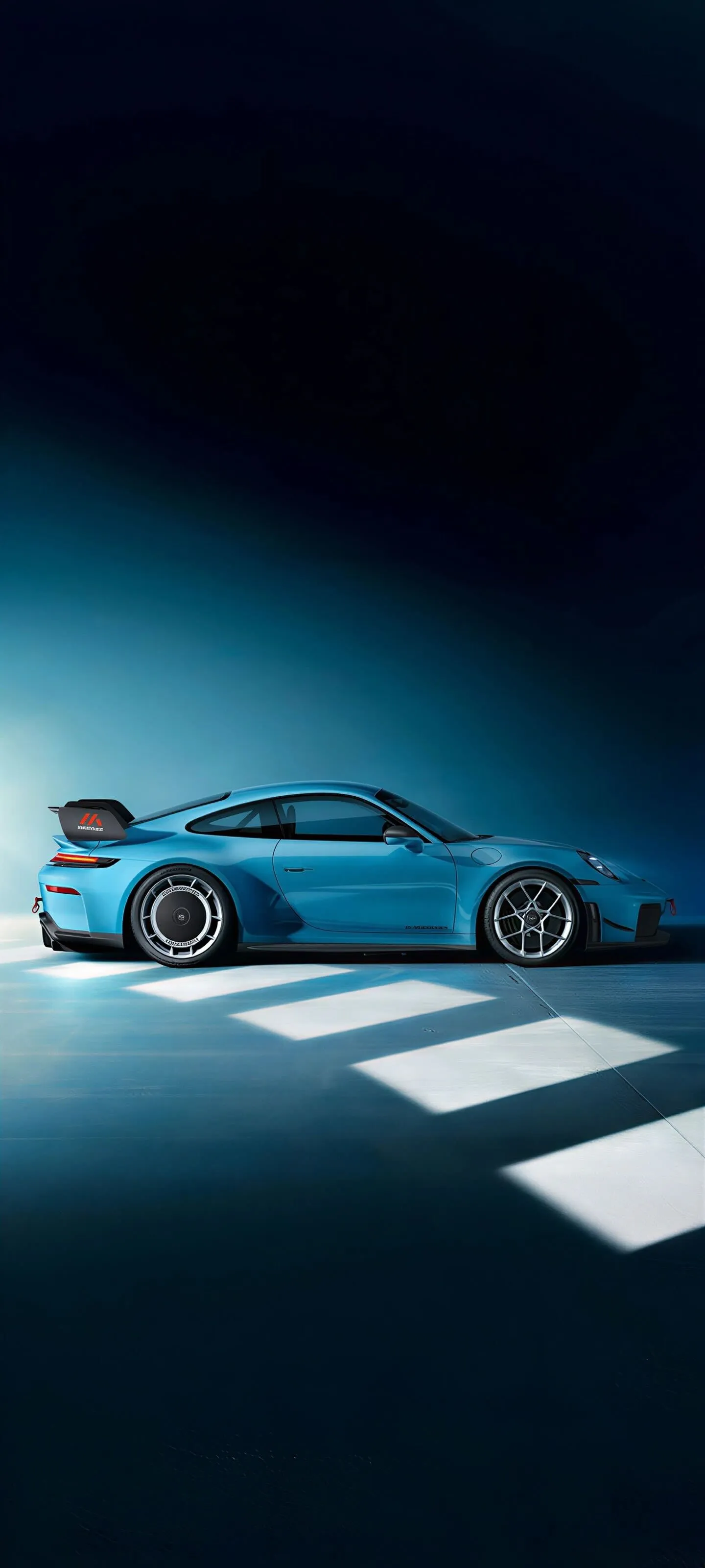 Download this stunning Porsche GT3 4K wallpaper for your iPhone, featuring a light blue paint job. Notice the contrasting wheel designs and the bold spoiler for a stylish look. This wallpaper is perfect for car enthusiasts.