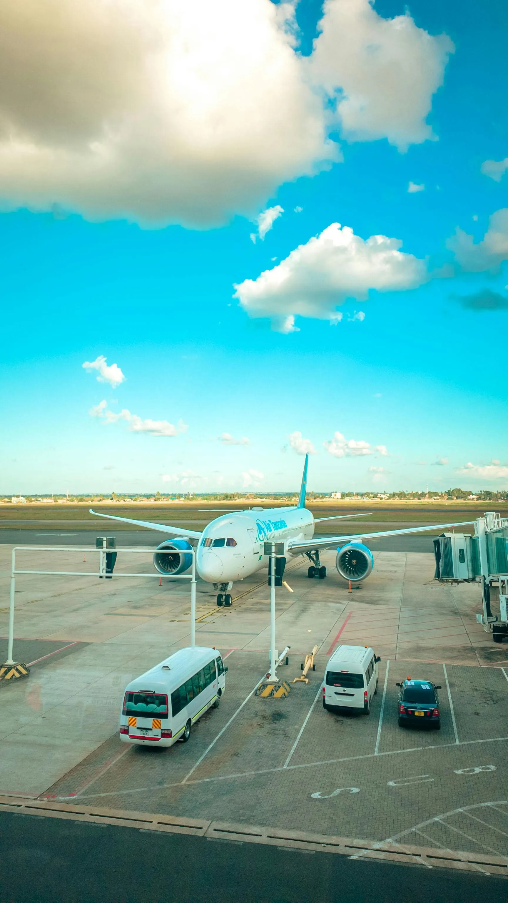 Free A passenger airplane docked at a gate in Dar es Salaam, Tanzania under a vibrant blue sky. Stock Photo
