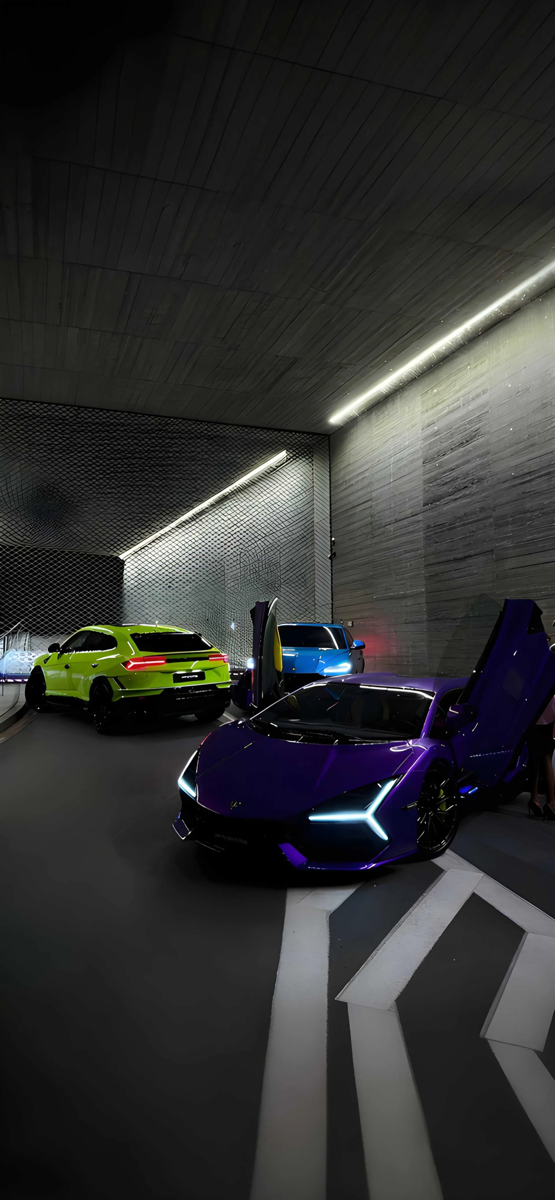 A high-octane underground scene featuring the cutting-edge Lamborghini Revuelto in deep purple and a vibrant lime green Lamborghini Urus. The sleek concrete tunnel architecture and glowing neon accents create a high-tech, luxury street-racing aesthetic perfect for enthusiasts of modern Italian engineering.