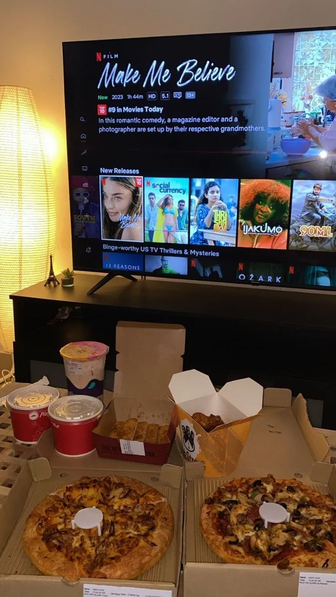 two pizzas sitting on top of cardboard boxes in front of a flat screen tv