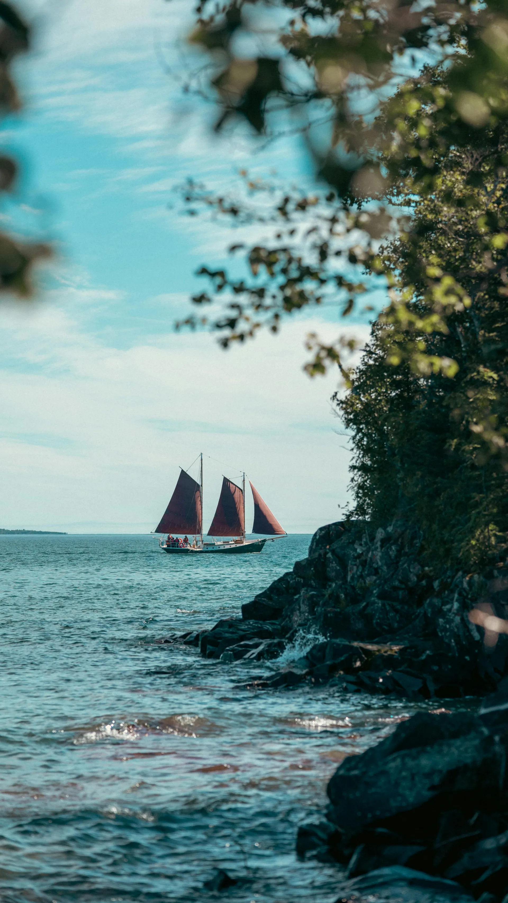 Free A serene seascape featuring a sailboat with red sails navigating along a rocky coastline. Stock Photo
