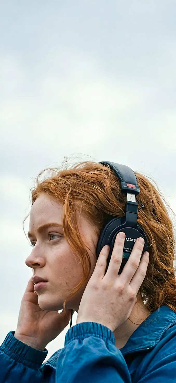 A striking, contemplative 4K portrait of Max Mayfield (Sadie Sink) with her signature red hair and headphones. The composition is clean and atmospheric, featuring her against a vast, bright, overcast sky. This high-resolution image highlights her pensive expression, making it a beautiful and introspective background for fans of the character.