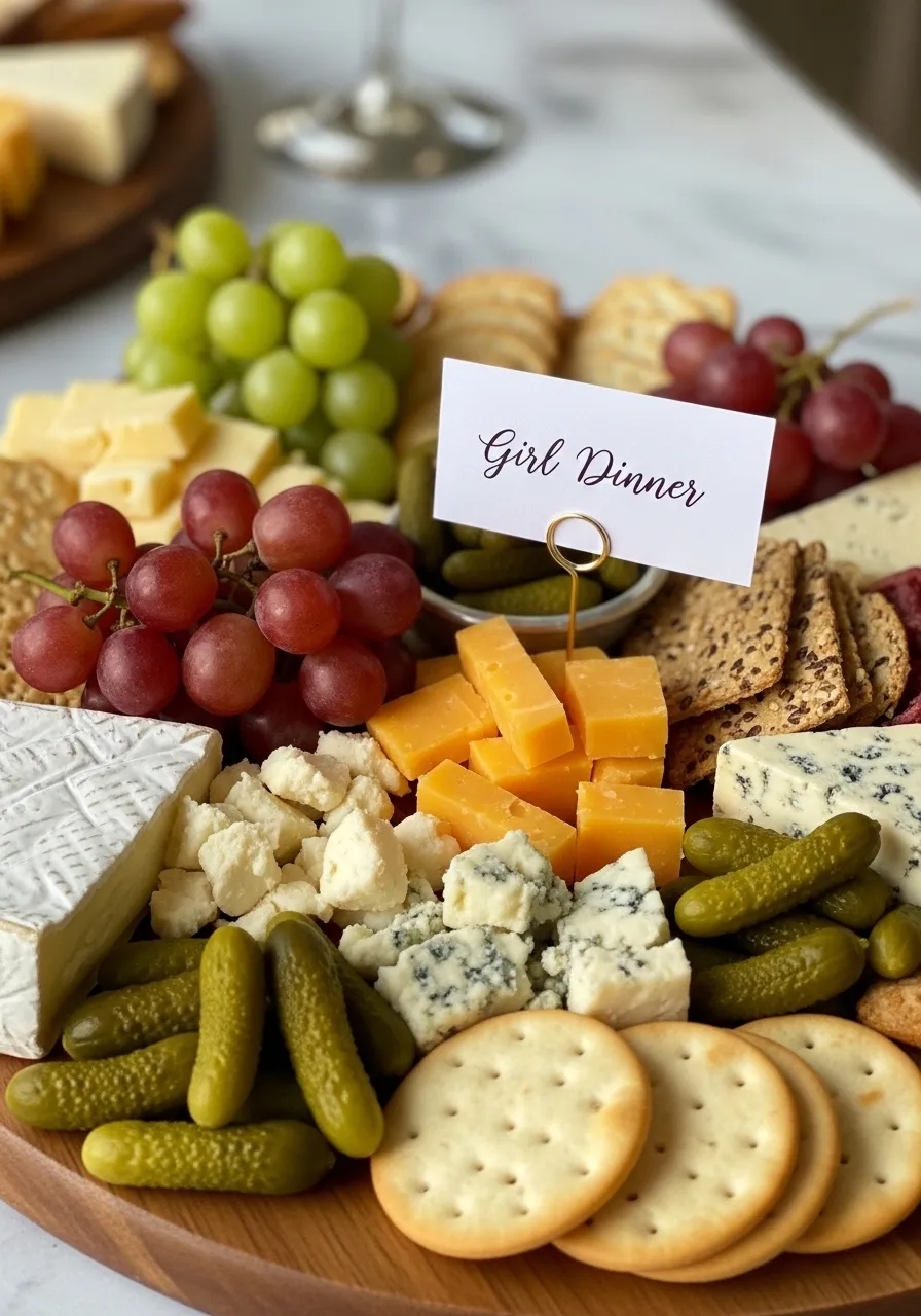 A delicious spread of cheeses crackers and grapes with a playful "Girl Dinner" sign.