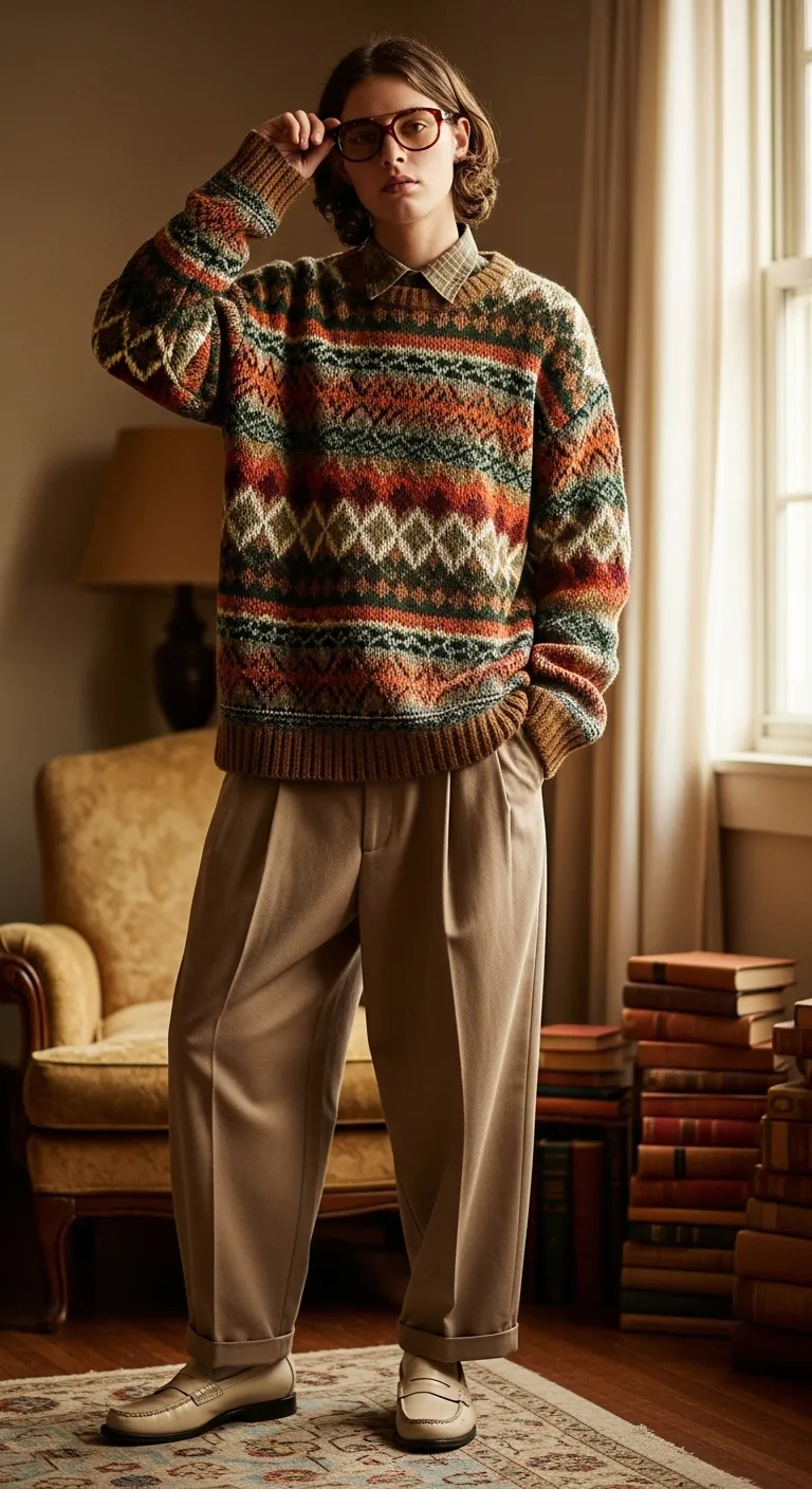 A male model wearing a vintage-style patterned sweater and loose trousers.