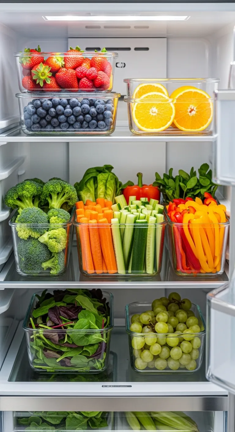 A clean refrigerator filled with fresh fruits and vegetables in glass meal prep containers.