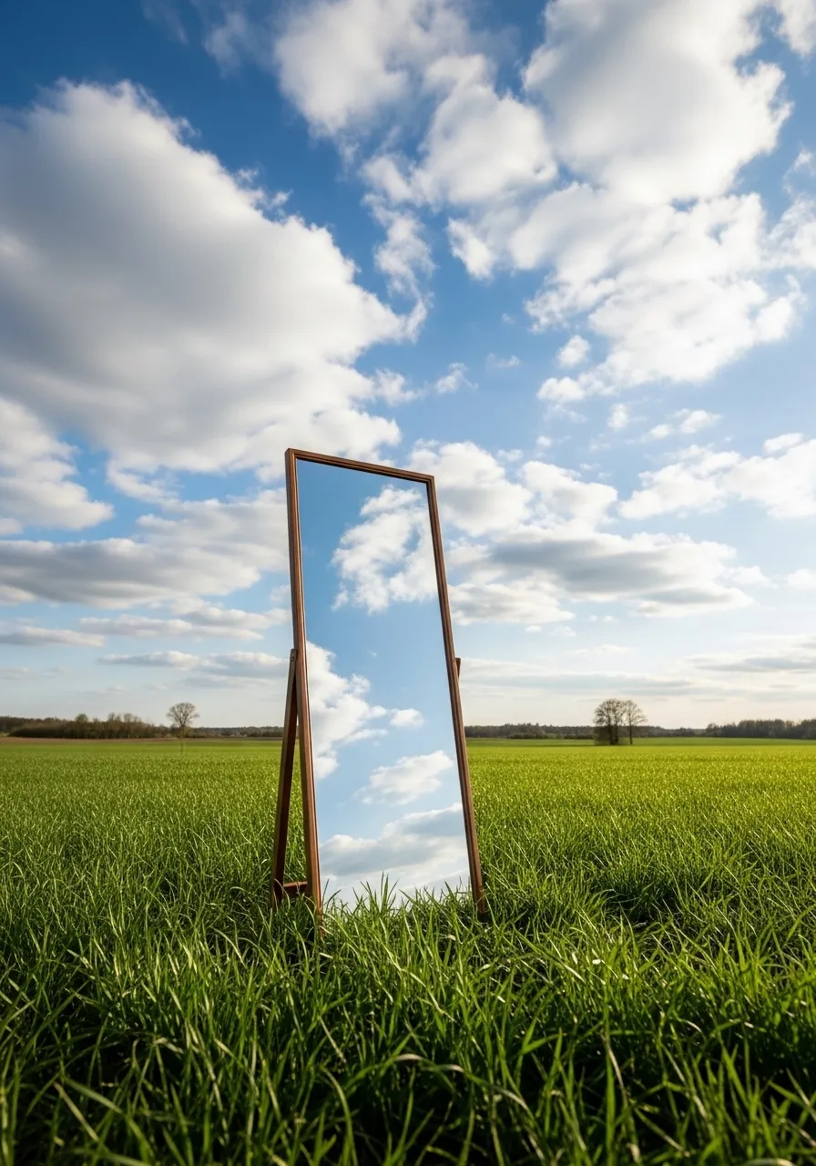 A full-length mirror standing in a green field reflecting the blue sky and clouds.