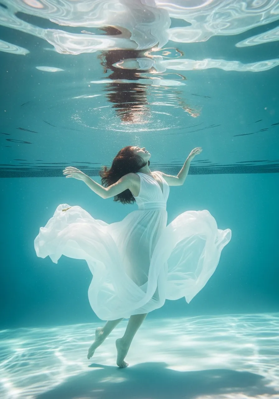 A woman in a flowing white dress floating gracefully underwater in a pool.