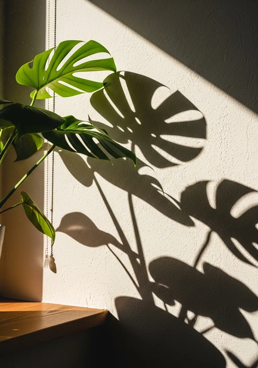 Dramatic sunlight casting a beautiful Monstera leaf shadow on a clean white wall.