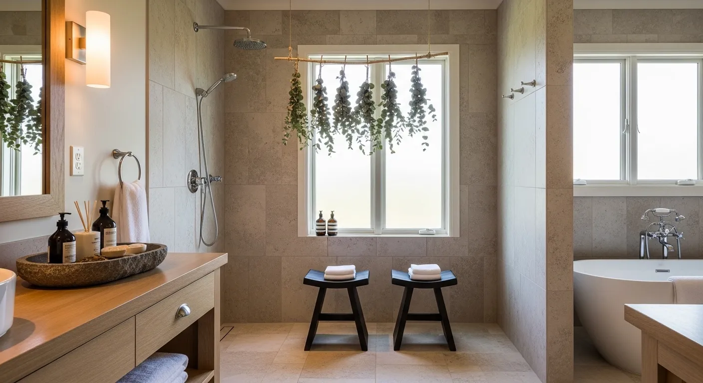 A modern bathroom featuring wooden stools and hanging dried eucalyptus over the tub.