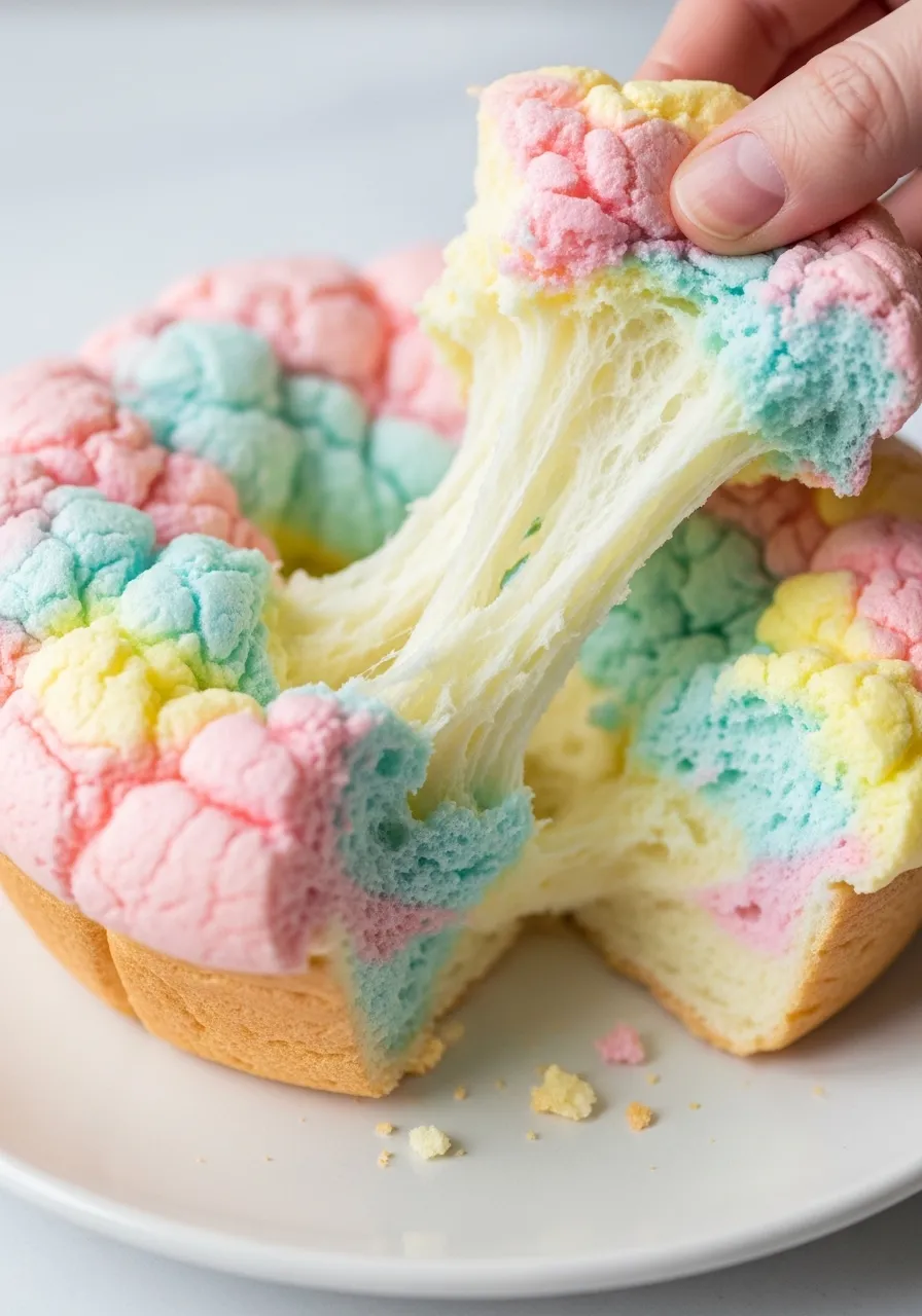 A pastel-colored airy bread being pulled apart to show its soft texture.