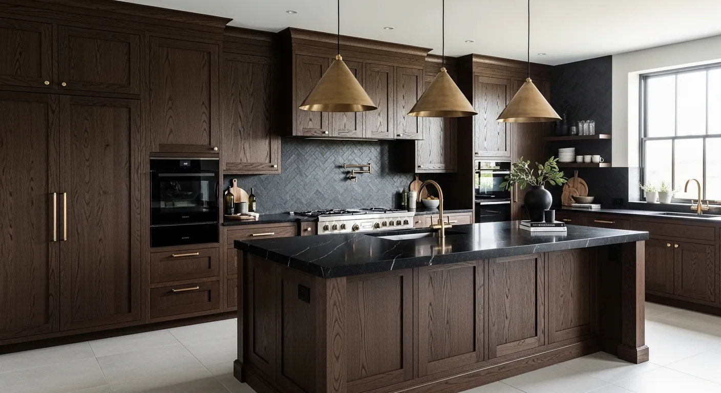 A sophisticated kitchen with dark oak cabinets and a black marble waterfall island.