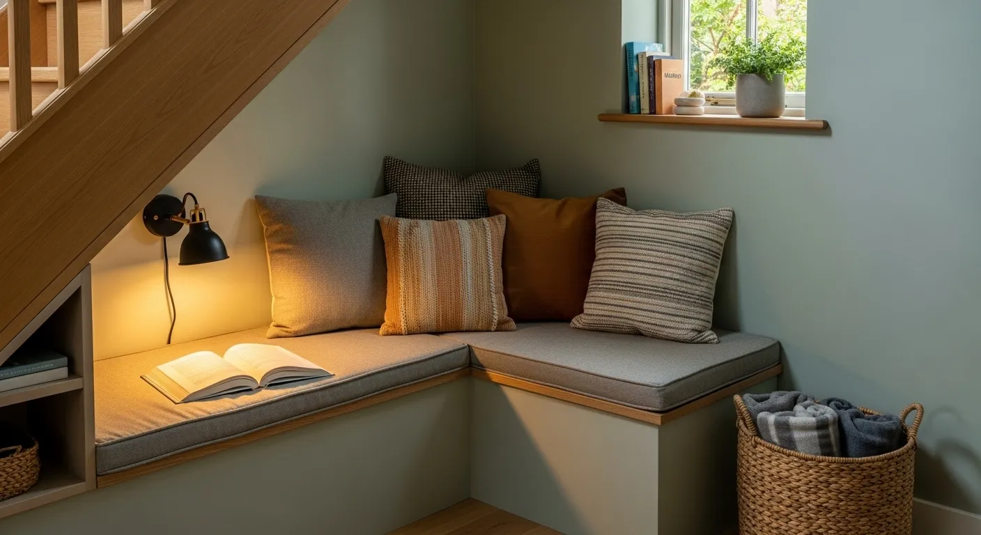 A custom built-in bench with pillows and warm lighting tucked under a staircase.