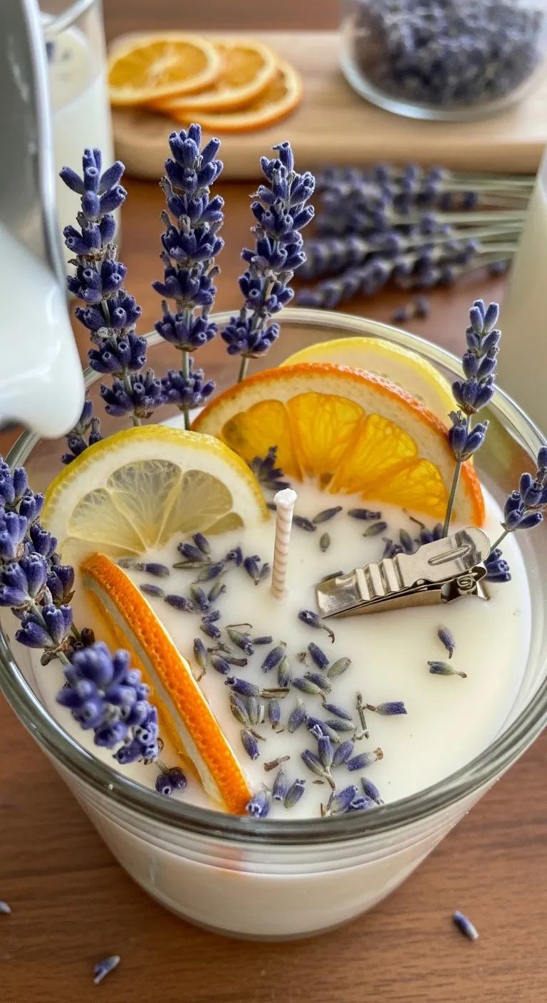 A hand-poured soy candle decorated with dried lavender buds and orange slices.
