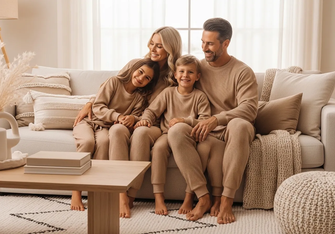 A family of four relaxing on a couch wearing coordinated beige lounge sets.
