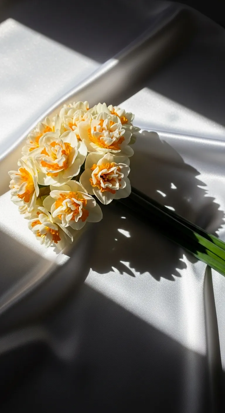 A bouquet of white and orange daffodils lying on white silk cloth.