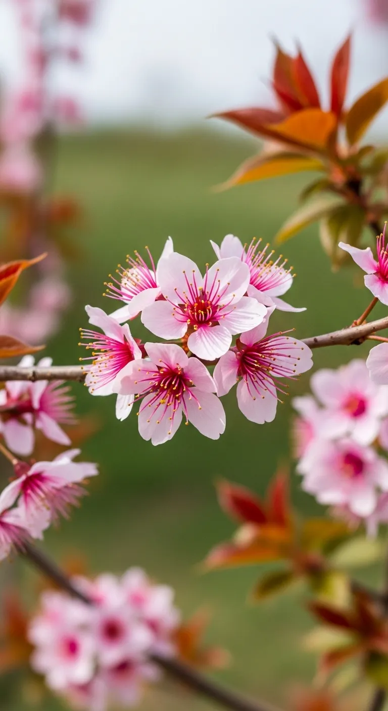 Close-up of pink cherry-like blossoms with yellow stamens.