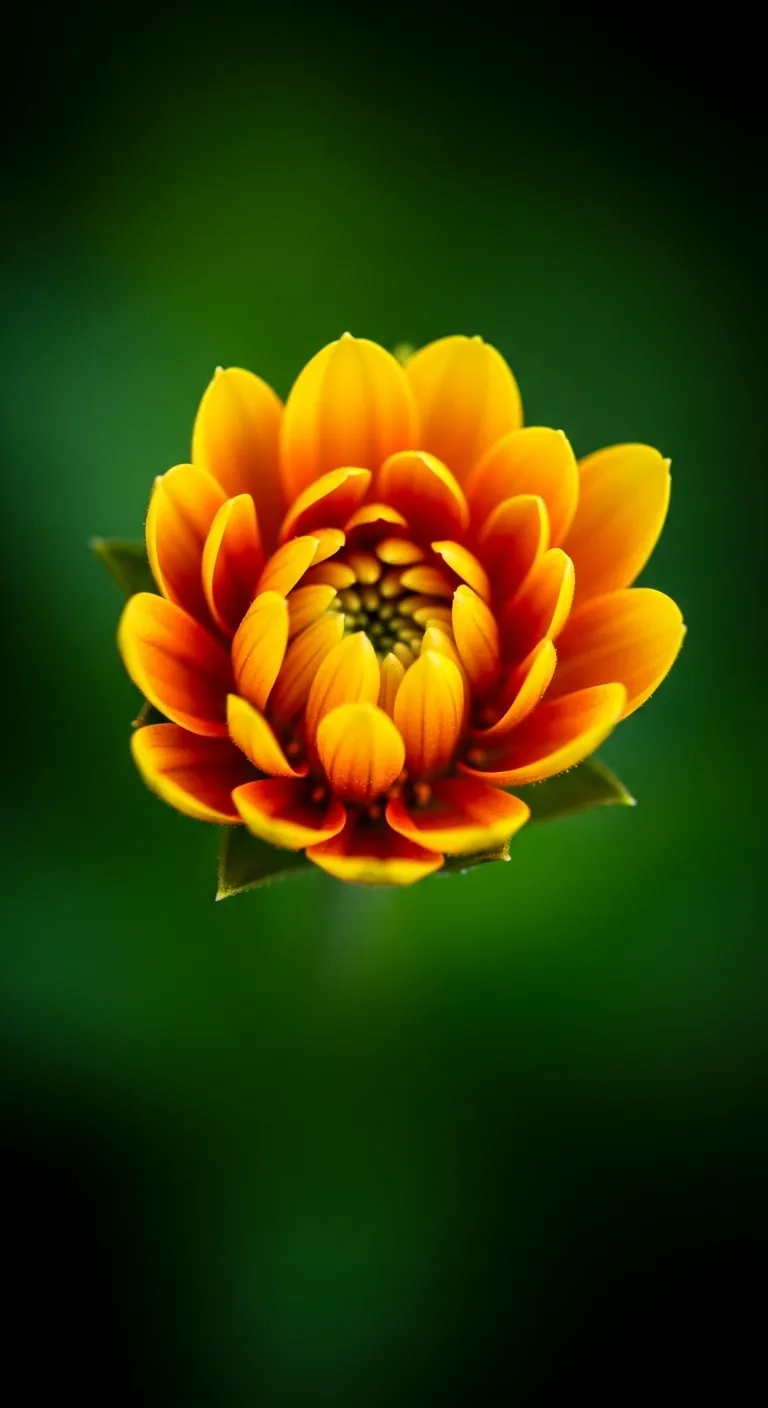 A close-up shot of a perfectly symmetrical orange and yellow dahlia.