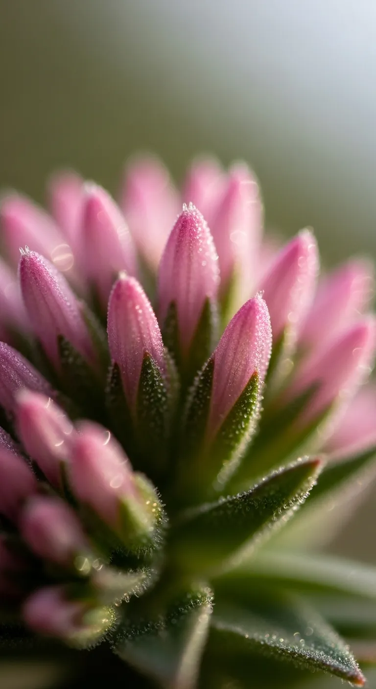 Macro shot of pink flower buds covered in morning dew.