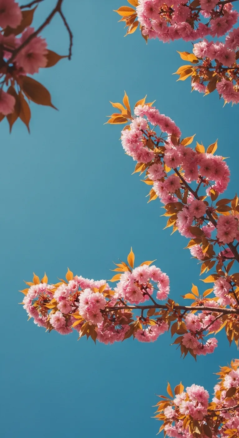 Bright pink cherry blossoms on a branch against a clear blue sky.