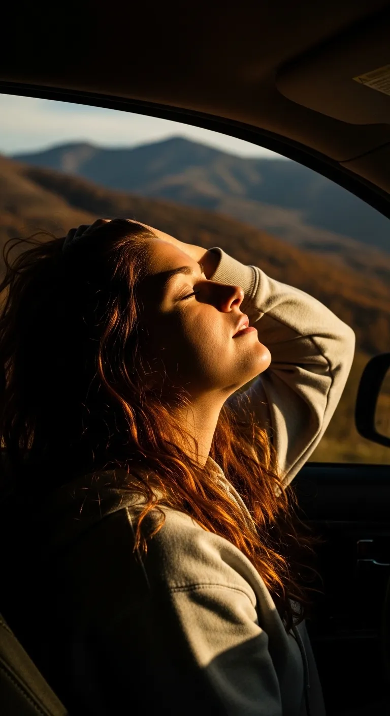 A woman inside a car with her eyes closed basking in the warm glow of the sun.