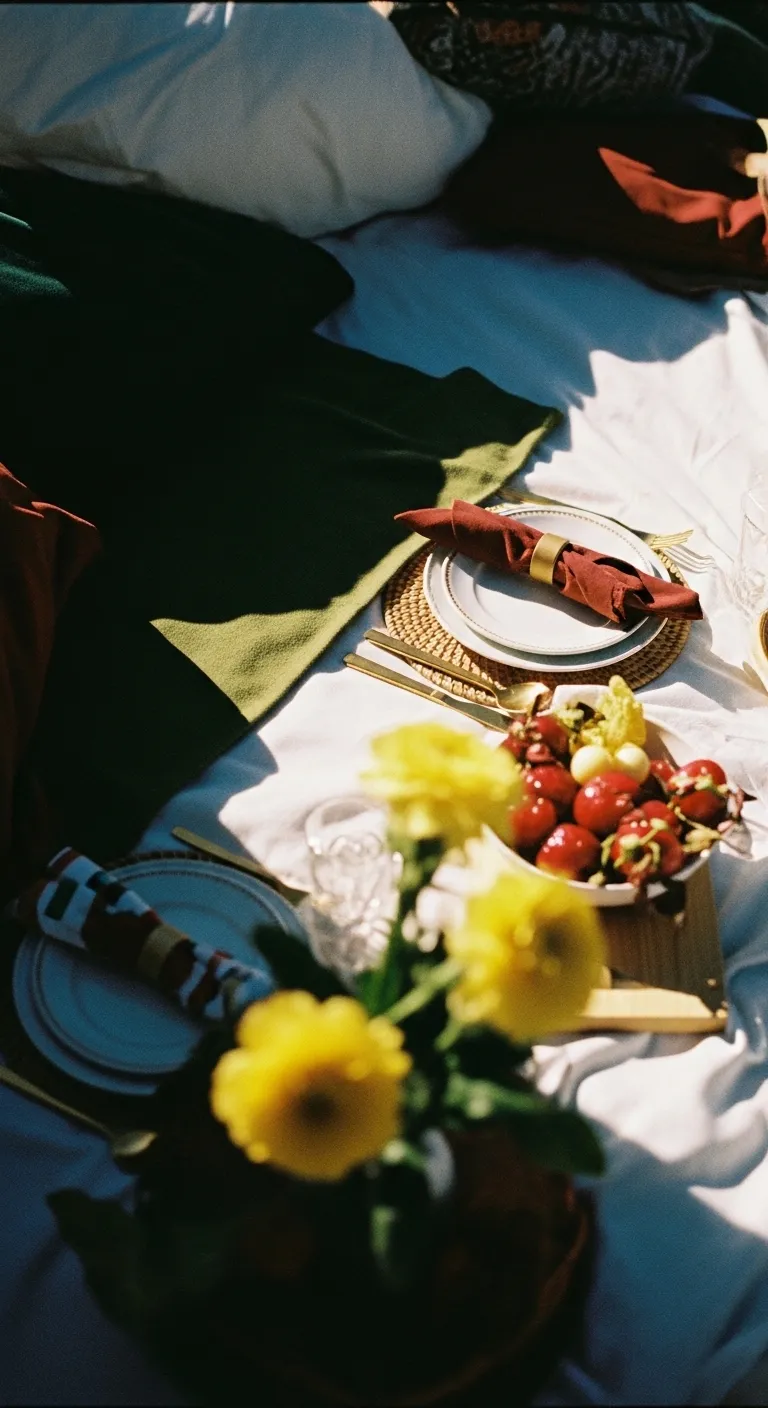 A close-up of an outdoor table setting with fruit wine and yellow flowers captured with a film-like texture.