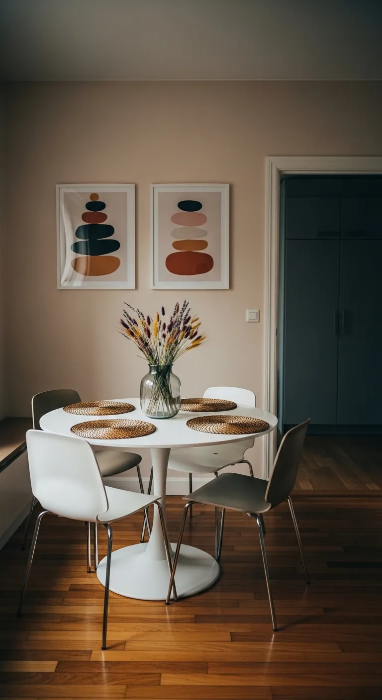A round white dining table with colorful abstract art on the wall.