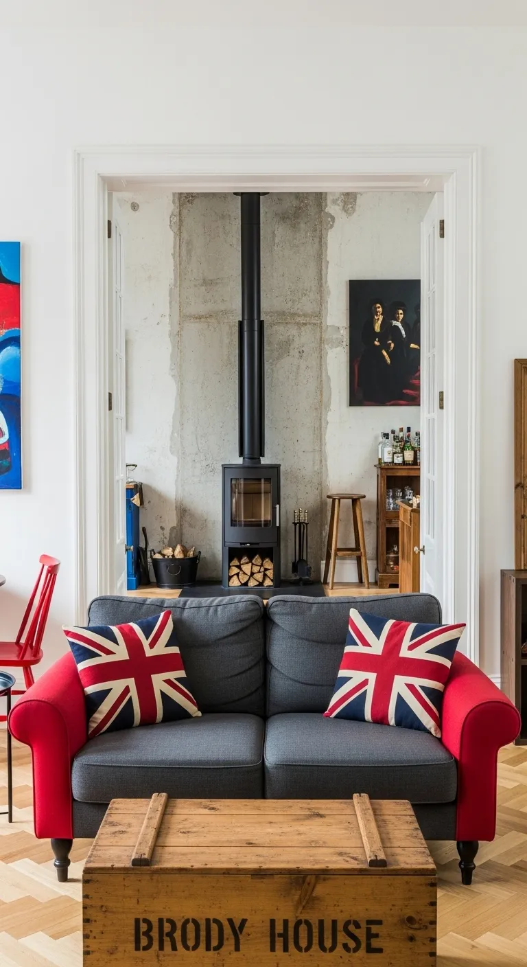 A grey sofa with Union Jack pillows in front of a rustic wood stove.