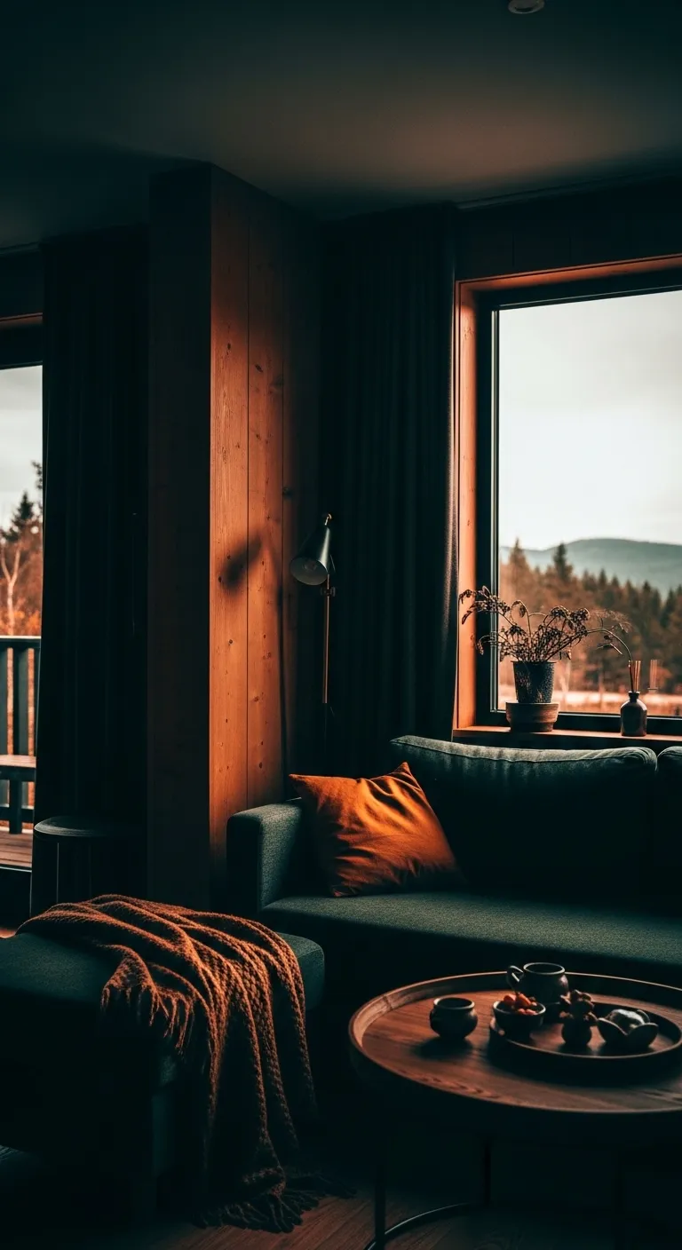 A dark teal living room with a warm wooden coffee table and orange accents.