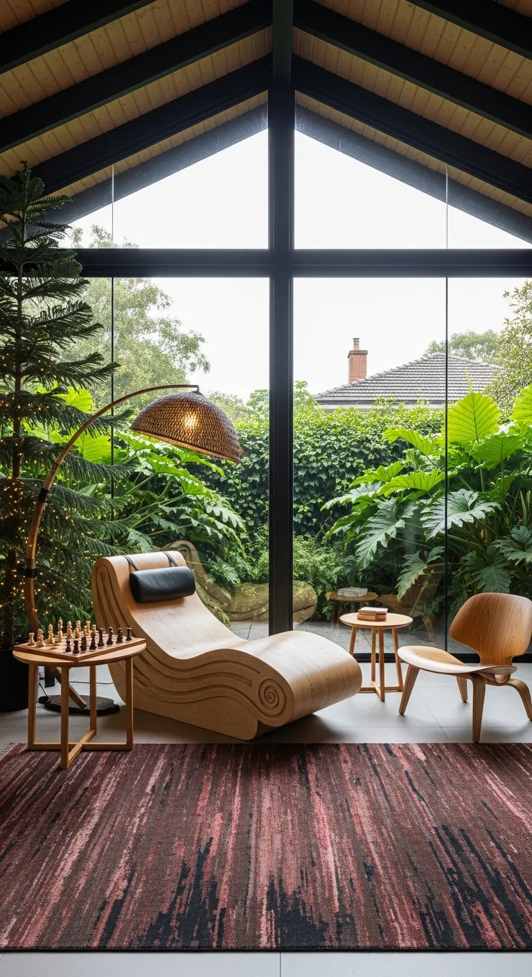 A unique wooden lounge chair in a room with large tropical plants.