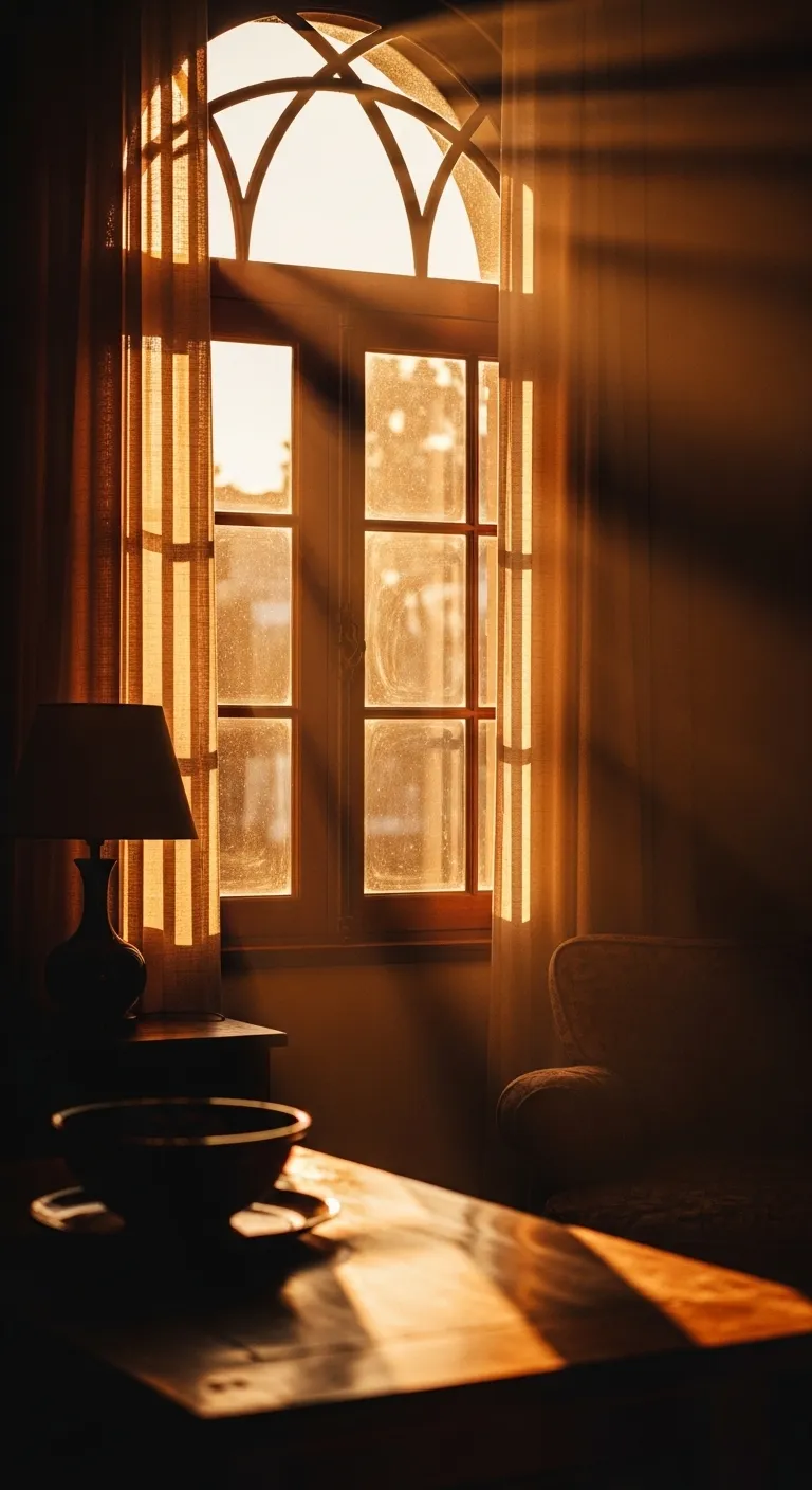 Golden sunset light streaming through a classic arched window onto a wooden table.