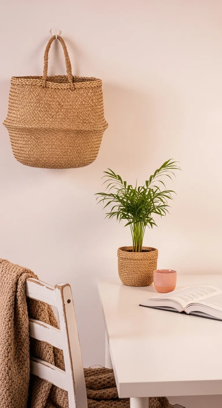 A clean white desk with a small palm plant and a woven bag hanging on the wall.