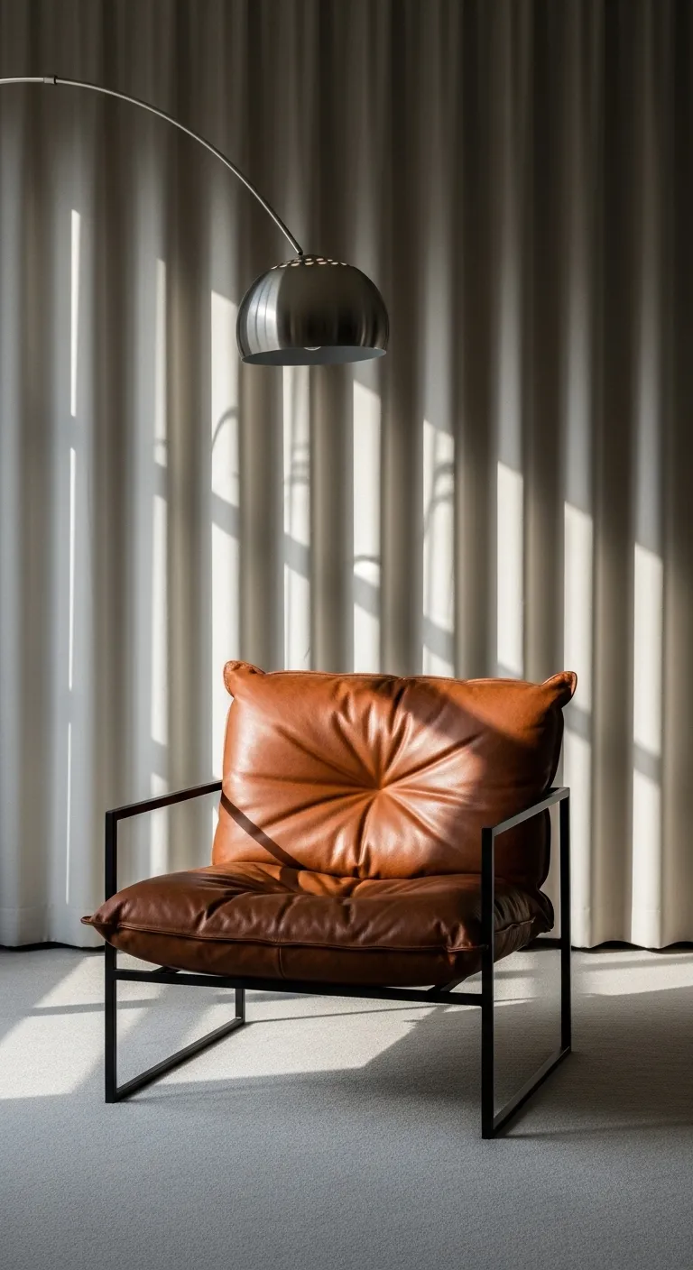 A brown leather armchair under a sleek metal floor lamp in a minimalist setting.
