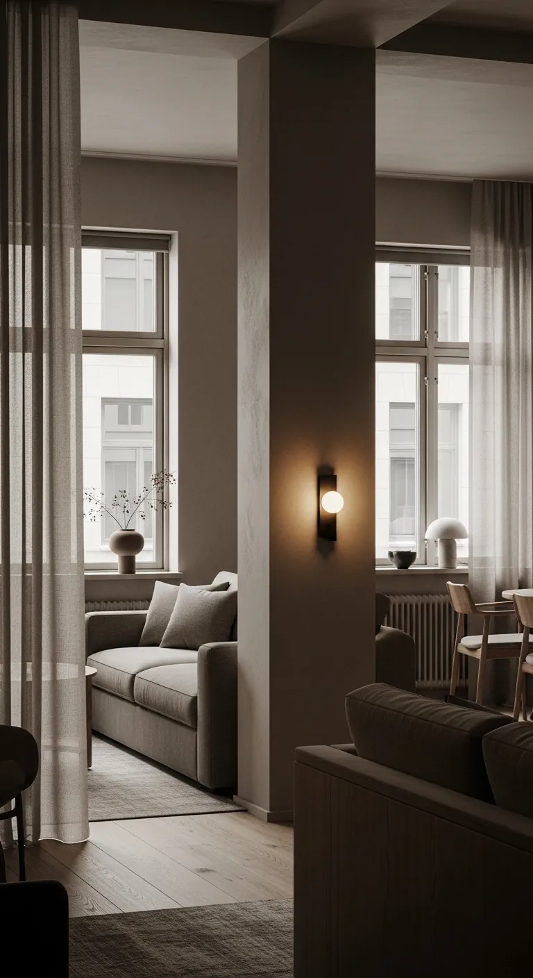 A modern lounge space with high ceilings neutral tones and a glowing wall lamp.