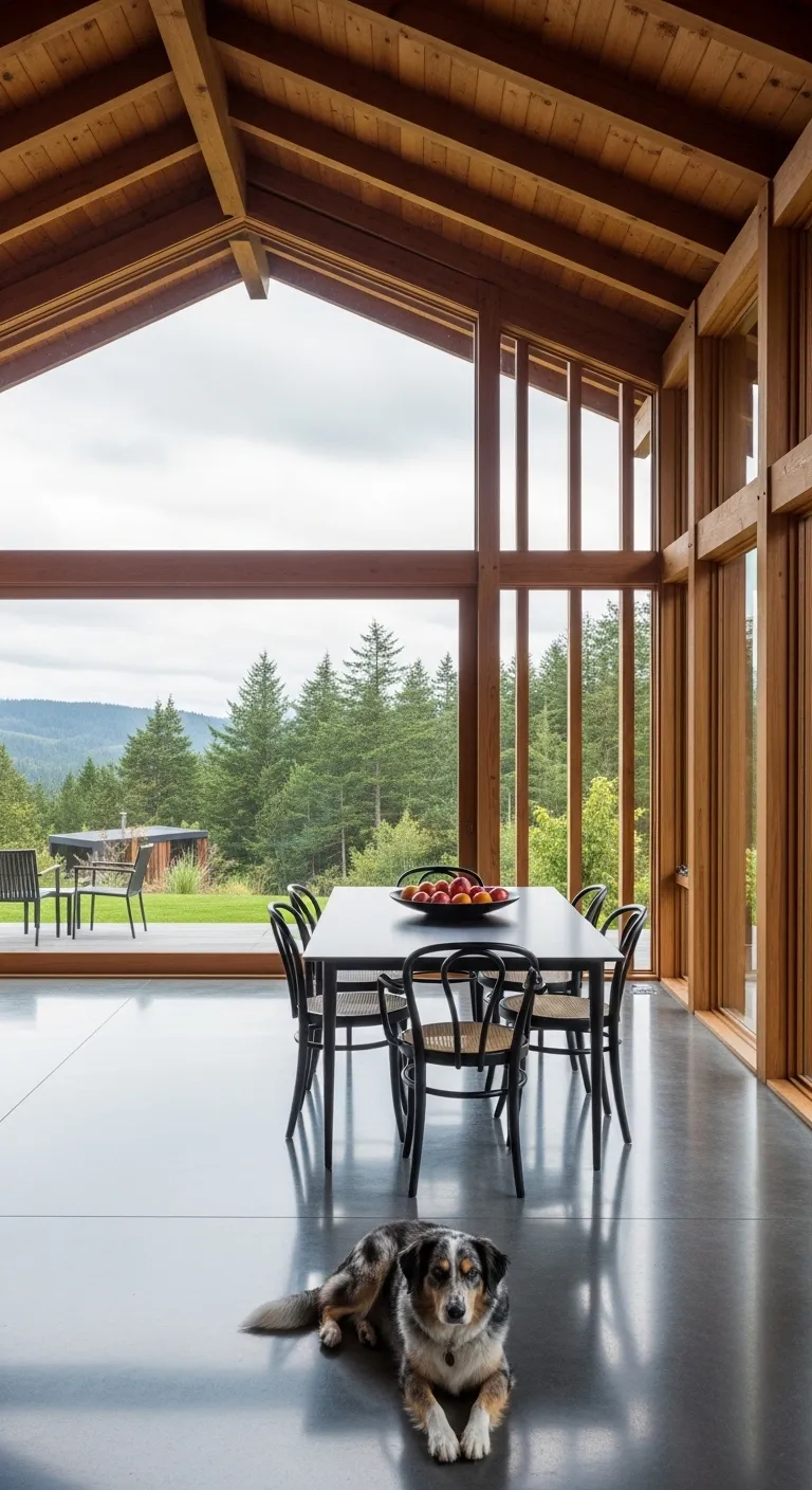 A spacious minimalist dining area with high wooden ceilings and floor-to-ceiling windows overlooking a forest.