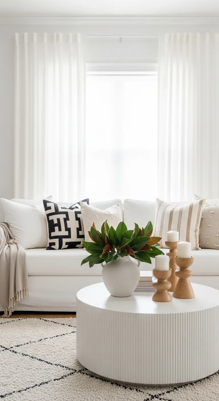A white sofa with black graphic pillows and a ribbed coffee table.