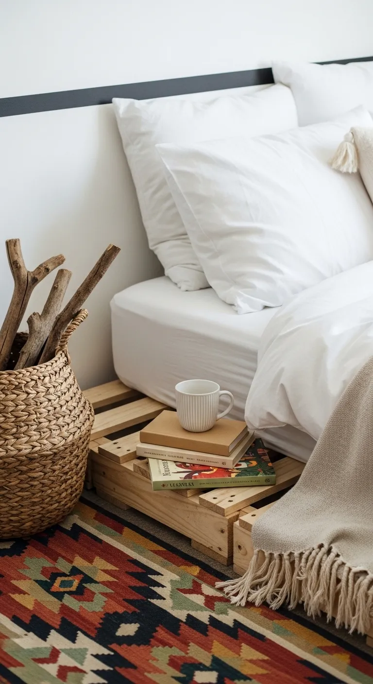 A bed on a wooden pallet frame with a colorful rug and books.