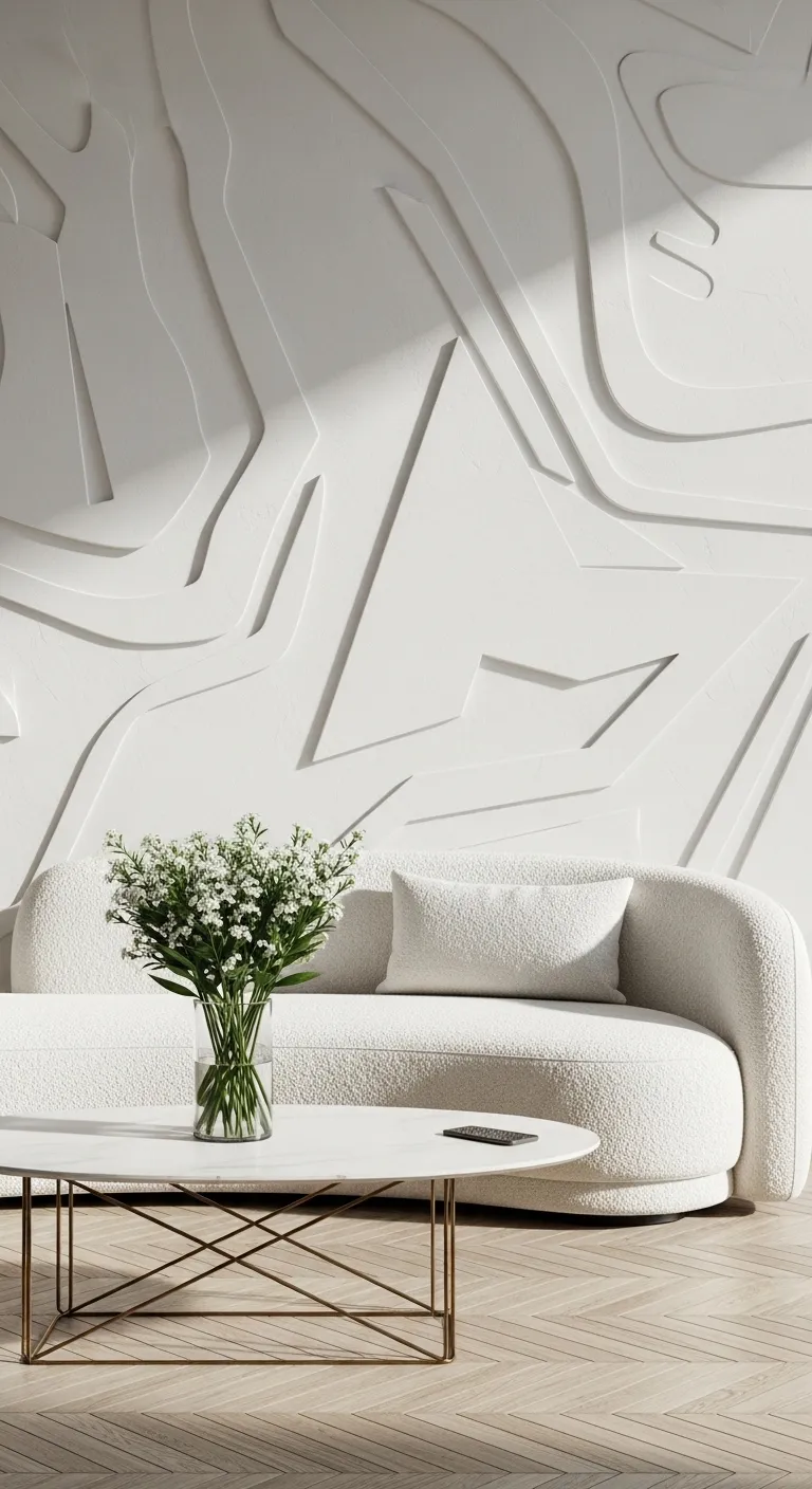 A modern white sofa in front of a large geometric textured wall.