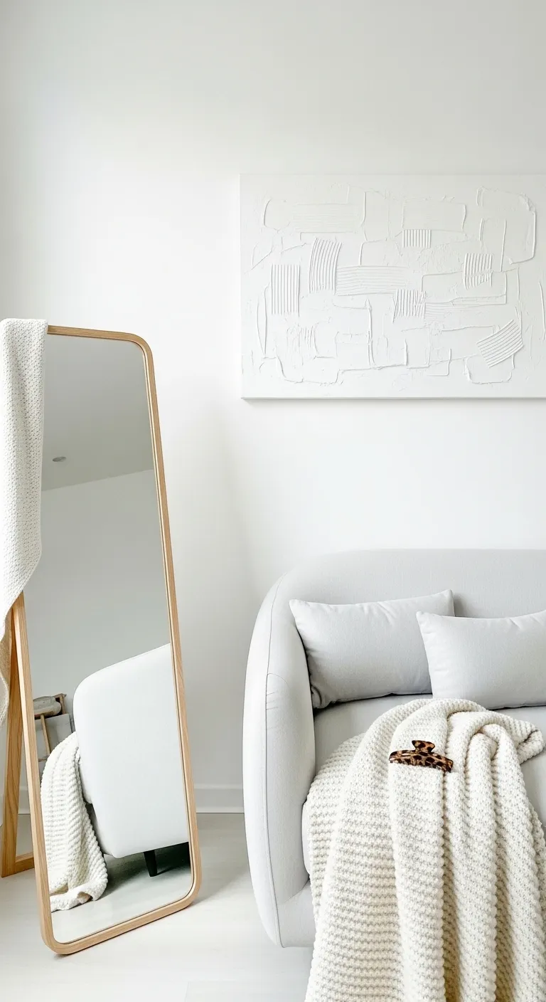 A white sofa with a chunky knit blanket next to a wooden floor mirror.