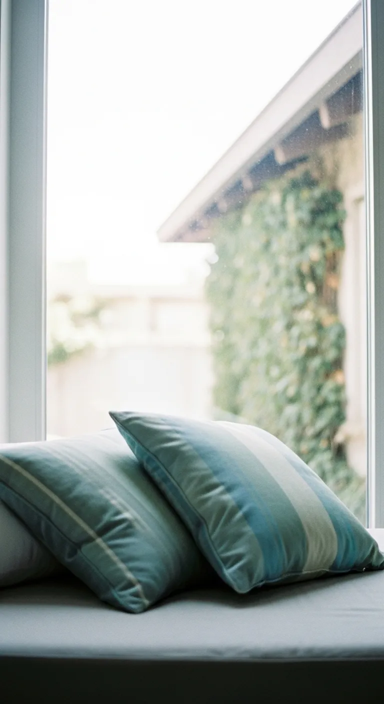Comfortable blue and white striped pillows on a sunlit window seat.